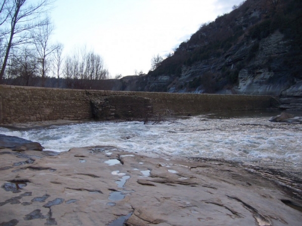 Resclosa lleugerament corbada d'uns 4-5 m d'altura, feta de còdols lligats amb ciment. Fa 80 m de longitud i té un contrafort de sosteniment. El canal surt a la dreta.